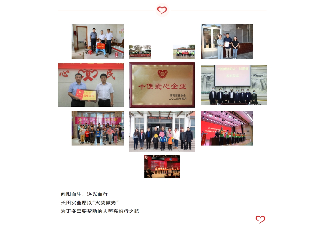 愛是善良之火,點亮希望的火炬;愛是治愈之光,驅(qū)散所有的黑暗。長田實業(yè)致力于以“火柴微光”,為需要幫助的人照亮前行之路。2020年,長田實業(yè)注資500萬元成立濟陽區(qū)首支“善美濟陽人”基金,弘揚善美精神,傳遞善美力量;2021年,向濟南市殘疾人福利基金會捐贈50萬元,向眼科醫(yī)院捐贈50萬元,在“愛心企業(yè)集中捐贈儀式”中,捐贈10萬元;2023年底,甘肅臨夏州積石山縣6.2級地震牽動人心,長田實業(yè)積極響應(yīng)區(qū)婦聯(lián)號召,向積石山縣捐贈價值3萬元的抗震救災(zāi)愛心物資;2024年4月,在濟南市紅十字應(yīng)急救援隊成立12周年活動中,捐贈3萬元,以高度的社會責任感傳遞長田慈善力量。