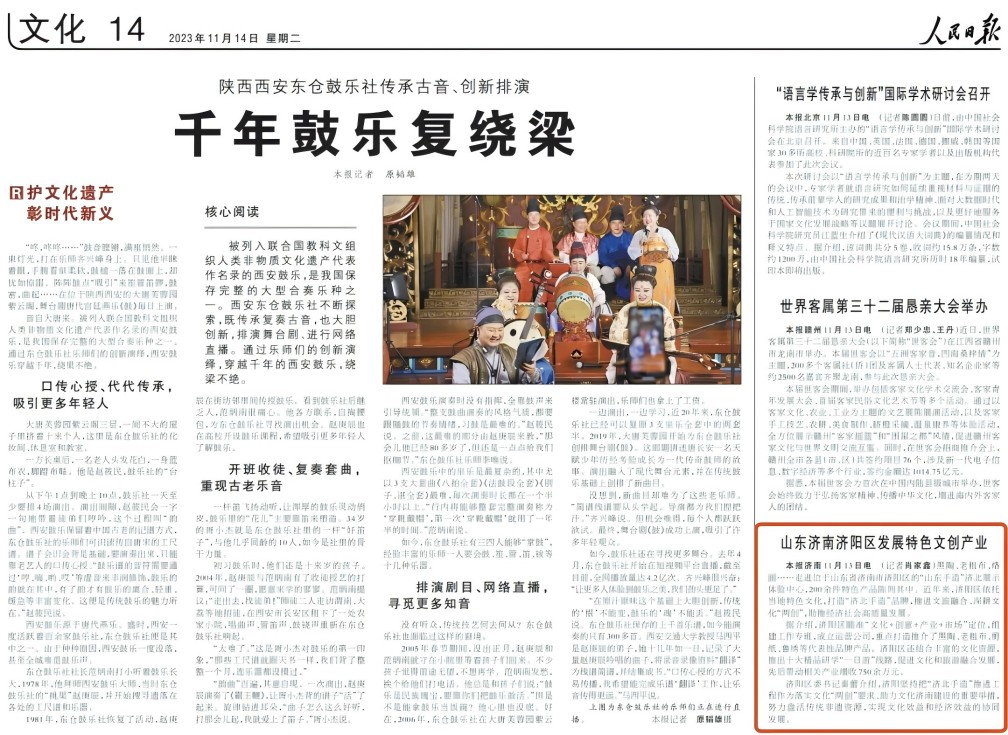 2023年11月14日,《人民日報》特別撰文為“濟北手造”點贊。公司在非遺手造文化方面的工作極大的推動了全區(qū)非遺手造文化的發(fā)展,以文潤城提升城市軟實力,彰顯民企擔當。