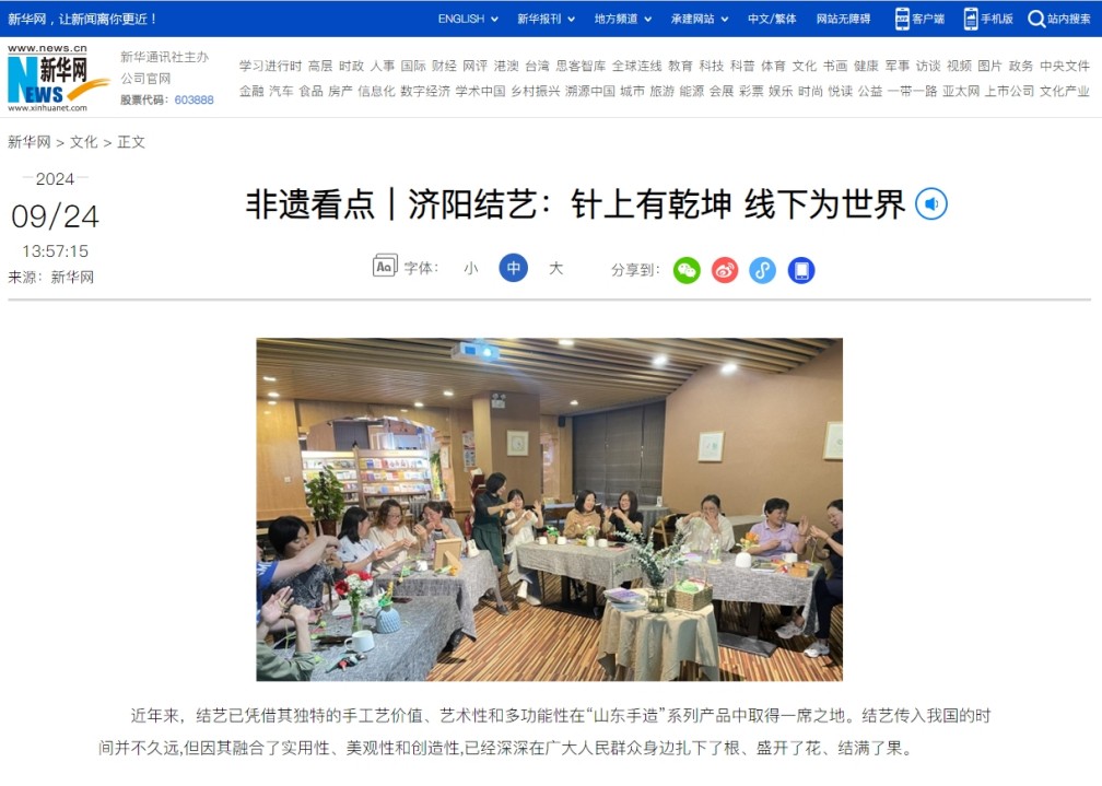2024年9月24日,新華網(wǎng)對濟北手造:濟陽結(jié)藝進行了點贊報道,稱之為“針上有乾坤 線下為世界”。2023年5月,由山東濟北手造文化發(fā)展有限公司擔任項目保護單位,將“濟陽結(jié)藝”進行了組織上報,并順利通過公示,成為濟南市濟陽區(qū)第七批非物質(zhì)文化遺產(chǎn)代表性項目。近年來,結(jié)藝已憑借其獨特的手工藝價值、?藝術(shù)性和多功能性在“山東手造”系列產(chǎn)品中取得一席之地。結(jié)藝傳入我國的時間并不久遠,但因其融合了實用性、美觀性和創(chuàng)造性,已經(jīng)深深在廣大人民群眾身邊扎下了根、盛開了花、結(jié)滿了果。