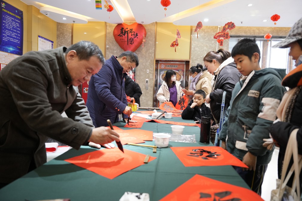 此外,在活動現(xiàn)場,濟(jì)陽區(qū)總工會主持“送萬福 進(jìn)萬家”書法公益活動,邀請書法家現(xiàn)場寫春聯(lián)、贈春聯(lián)、送“?!弊?,用筆墨丹青為廣大市民送上新春的美好祝福。